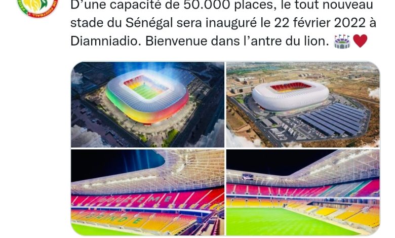هذا وقد أعلن الاتحاد السنغالي لكرة القدم موعد افتتاح الملعب وكتب في صفحته الرسمية على تويتر: “الملعب الجديد للسنغال يتسع لـ 50000 متفرج سيتم افتتاحه يوم 22 فبراير 2022 مرحبا بكم في عرين الأسود. ”