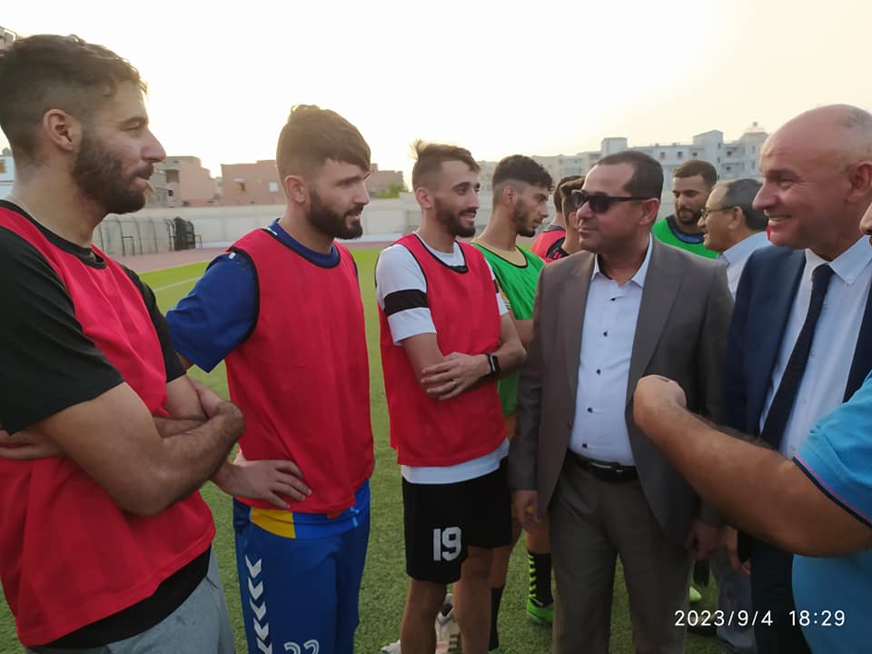 الزيارة للفريق في حصته التدريبية تأتي لتشجيع و تحفيز اللاعبين على التركيز على هدف الصعود و العودة إلى حضيرة الكبار.