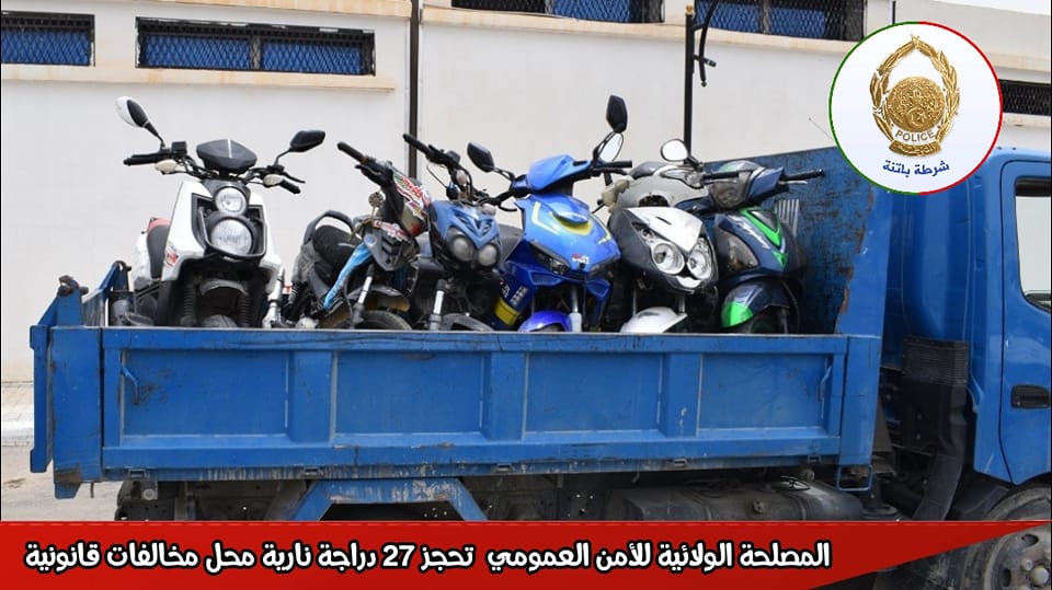 قام عناصر المصلحة الولائية للأمن العمومي خلال اليومين الفارطين بحجز 12 دراجة نارية محل مخالفات و تحويل 15 أخرى إلى المحشر البلدي مع اتخاذ الاجراءات القانونية ضد مستعمليها في إطار تحقيق الاهداف الرامية لضبط حركة سير هذه الوسيلة و التي في الكثير من الاحيان تكون سببا في حوادث المرور و تستخدم من قبل بعض الاشخاص في تنفيذ العديد من الجرائم منها السرقة كما يتم العمل على تحسيس سائقي هذه الفئة لضمان أمن و سكينة المواطن و مستعمل الدراجة على حد سواء.