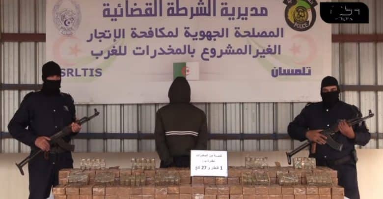 وأوضح المصدر ذاته أنه، «مواصلة لجهودها الميدانية في التصدي لجرائم الاتجار بالمخدرات، تمكنت المصلحة الجهوية لمكافحة الاتجار غير المشروع بالمخدرات (SRLTIS) بتلمسان، خلال هذا الأسبوع، من توقيف شخص ينشط ضمن شبكة إجرامية منظمة، مع ضبط 1 قنطار و27 كيلوغراما من الكيف المعالج مصدره المغرب.