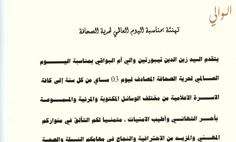 ام البواقي: والي الولاية يهنئ الأسرة الإعلامية بمناسبة اليوم العالمي للصحافة