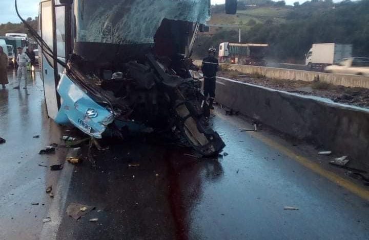 خلف حادث مرور خطير صبيحة اليوم قتيلا كحصيلة أولية إثر اصطدام حافلة بسيارة وشاحنة على مستوى الطريق السيار مخرج نفق عين شريكي بالبويرة