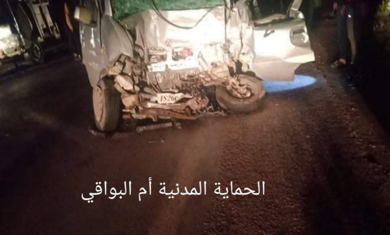 اين خلف الحادث اصابة شخصين،ب.ب.ع شاب 26 سنة له إصابة في الصدر و الرجل اليسرى .و ر.ن رجل 42 سنة له جرح في الوجه والراس.و ع.ا.ل.ع شاب 29 سنة متوفي في عين المكان جميع الضحايا قدمت لهم الاسعافات الاولية في عين المكان ثم تم تحويلهم بواسطة إسعافات الحماية المدنية الى مستشفى سليمان عميرات بعين مليلة ،وفي نفس الوقت تم تحويل جثة الضحية الى مصلحة حفظ الجثث.