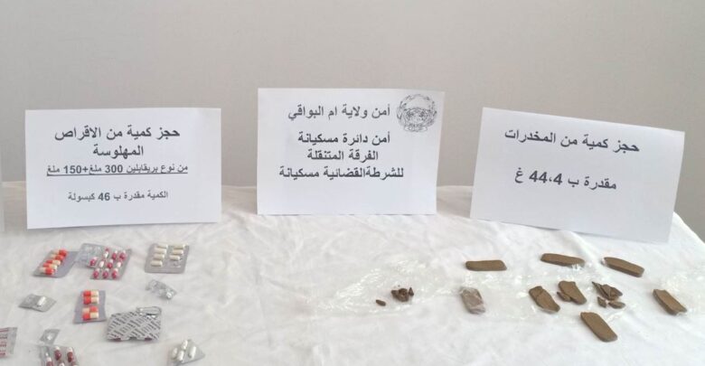أفادت خلية الإعلام والاتصال لآمن ولاية أم البواقي في بيان لها ، أن عناصر الشرطة بالفرقة المتنقلة للشرطة القضائية بمسكيانة بام البواقي تمكنت من توقيف شخص و حجز كمية من المؤثرات العقلية و المخدرات (كيف معالج) وهذا في إطارمحاربة مختلف أشكال الجريمة لاسيما ماتعلق بالمتاجرة بالمؤثرات العقلية و المخدرات