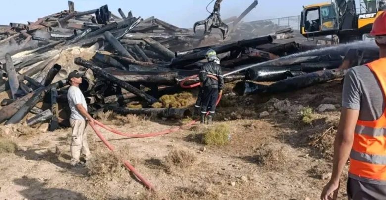 نشب الحريق في مخزون بالهواء الطلق لأنابيب حديدية من الحجم الكبير مغلقة بمادة أزفلتية.