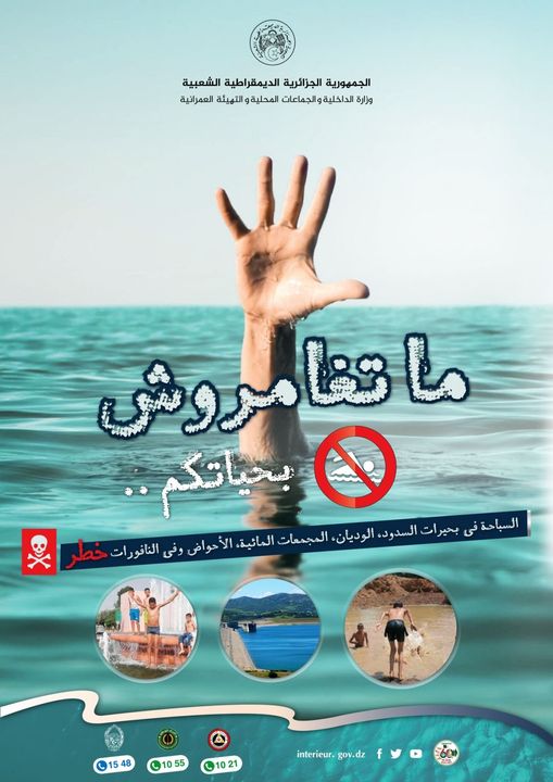 وجاء في بيان الوزارة، بمناسبة موجة الحر ” تجنبوا السباحة في البحيرات، السدود، الوديان، المجمعات والبرك المائية الأحواض وفي النافورات…ما تغامروش بحياتكم”.